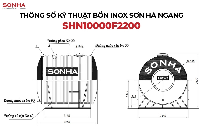 Kích thước bồn nước inox công nghiệp Sơn Hà 10000l ngang F2200