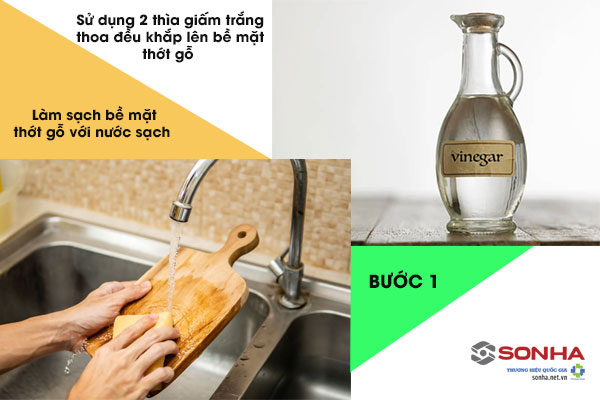 • Bước 1: Đầu tiên, bạn cần làm sạch bề mặt thớt gỗ với nước sạch. Sau đấy, bạn sử dụng 2 thìa giấm trắng (tùy thuộc vào diện tích bề mặt thớt mà bạn lấy lượng giấm trắng thích hợp) thoa đều lên khắp bề mặt thớt gỗ.