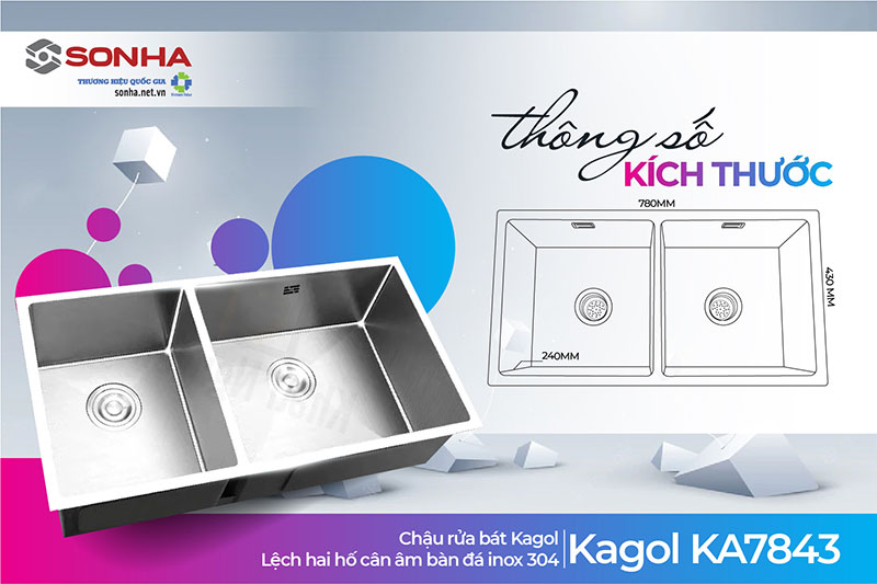 Sản phẩm chậu rửa Kagol KA7843 - Lệch 2 hố lệch là dòng sản phẩm bồn rửa chén inox được thiết kế thủ công, sản phẩm được đúc khuyên khối và sản xuất trên dây chuyền công nghệ cao của Hàn Quốc, không có mối hàn.