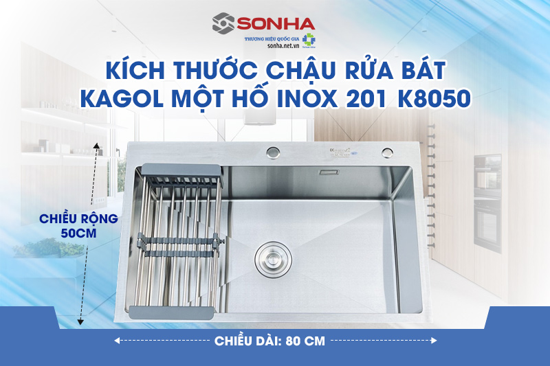 Kích thước chậu rửa bát KAGOL một hố K8050 inox 201