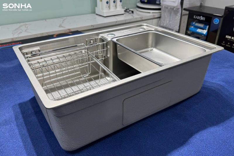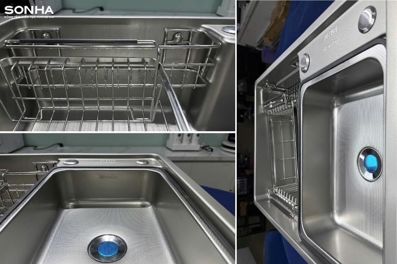 Mặt đáy chậu được trang bị lớp chống ồn tiêu chuẩn, giúp hạn chế tối đa âm thanh khó chịu trong quá trình sử dụng, đặc biệt hữu ích với gia đình có trẻ nhỏ hoặc không gian bếp liền phòng khách. Nhờ đó, trải nghiệm sử dụng chậu rửa bát trở nên dễ chịu, êm ái và thoải mái hơn.